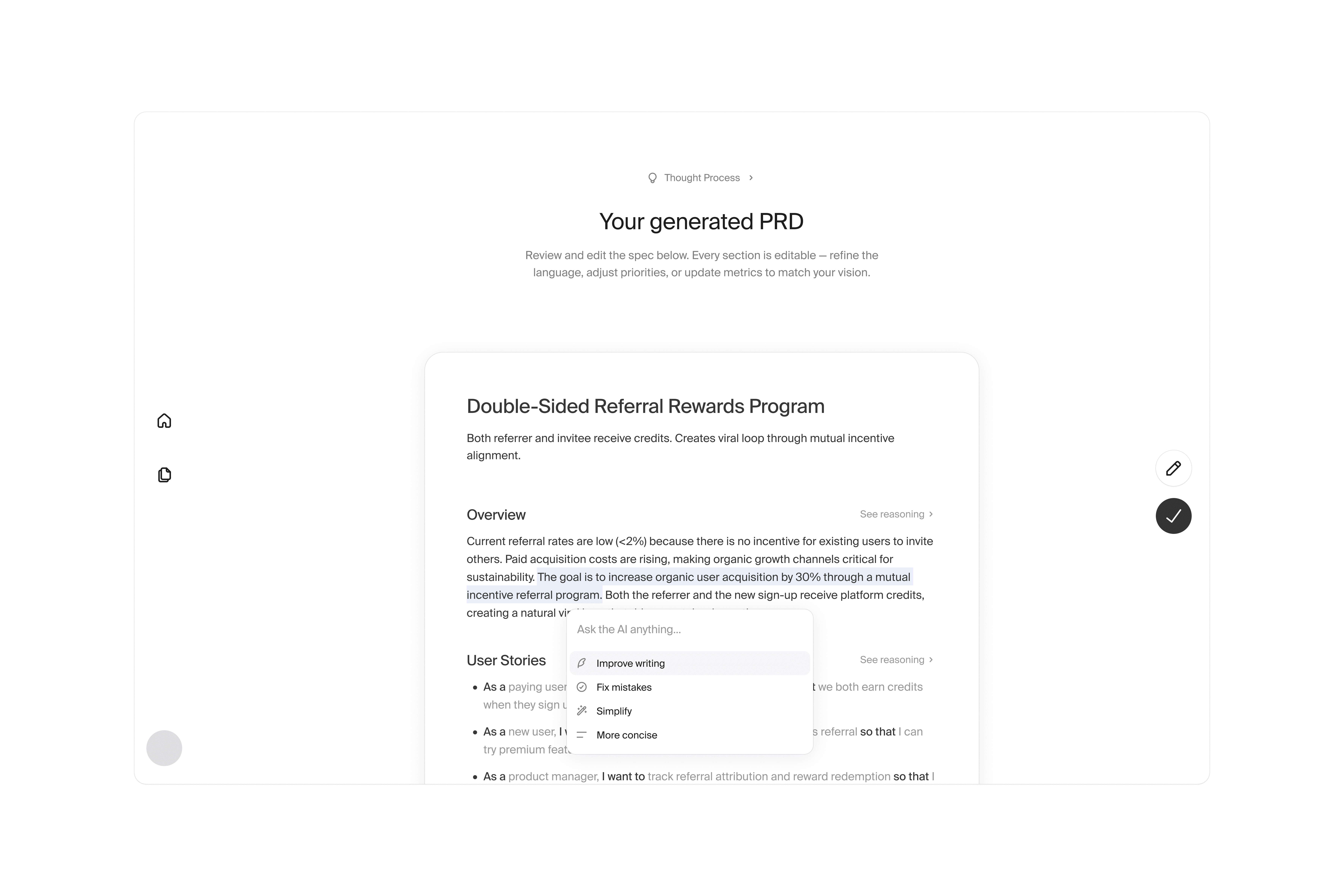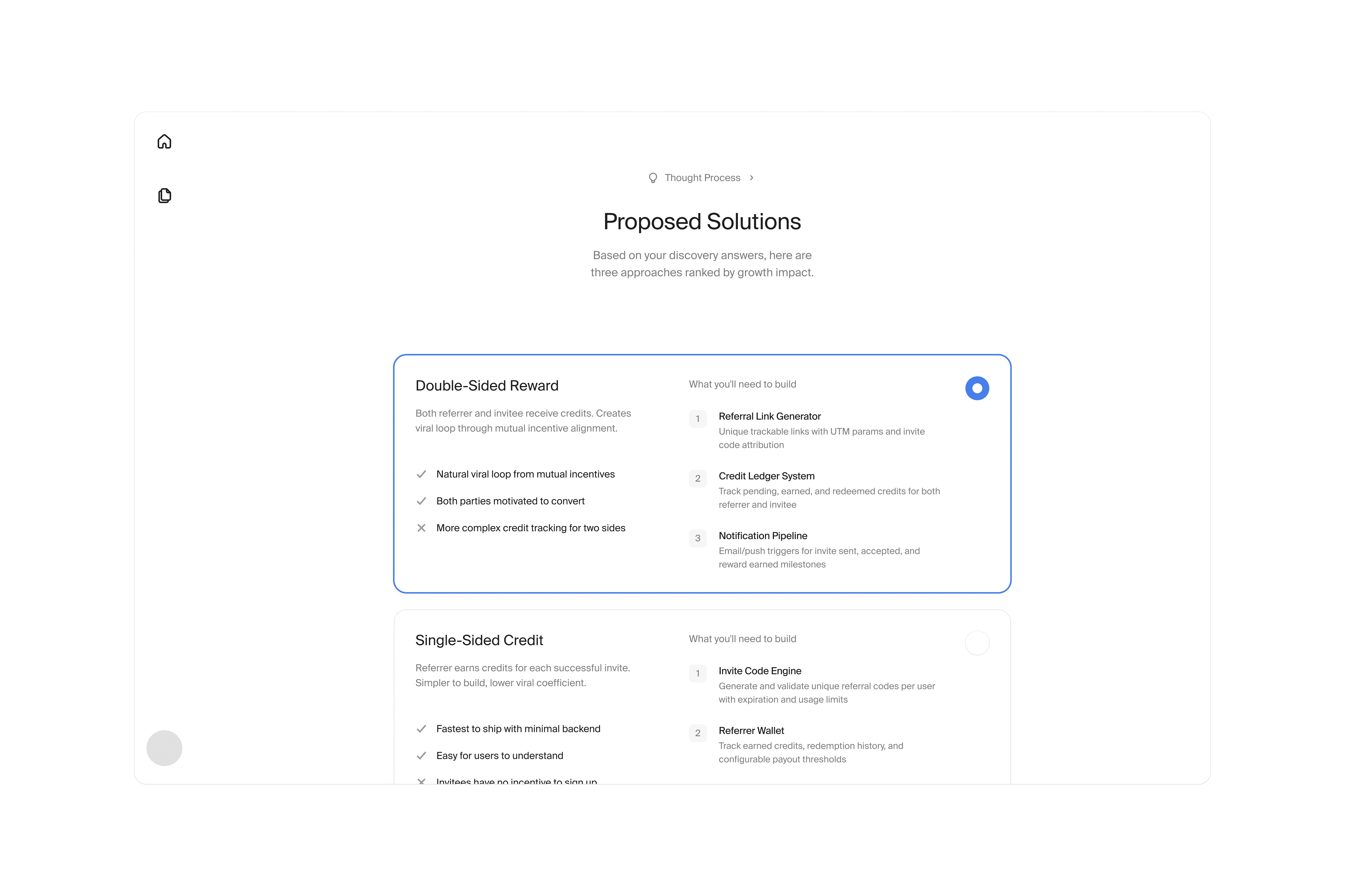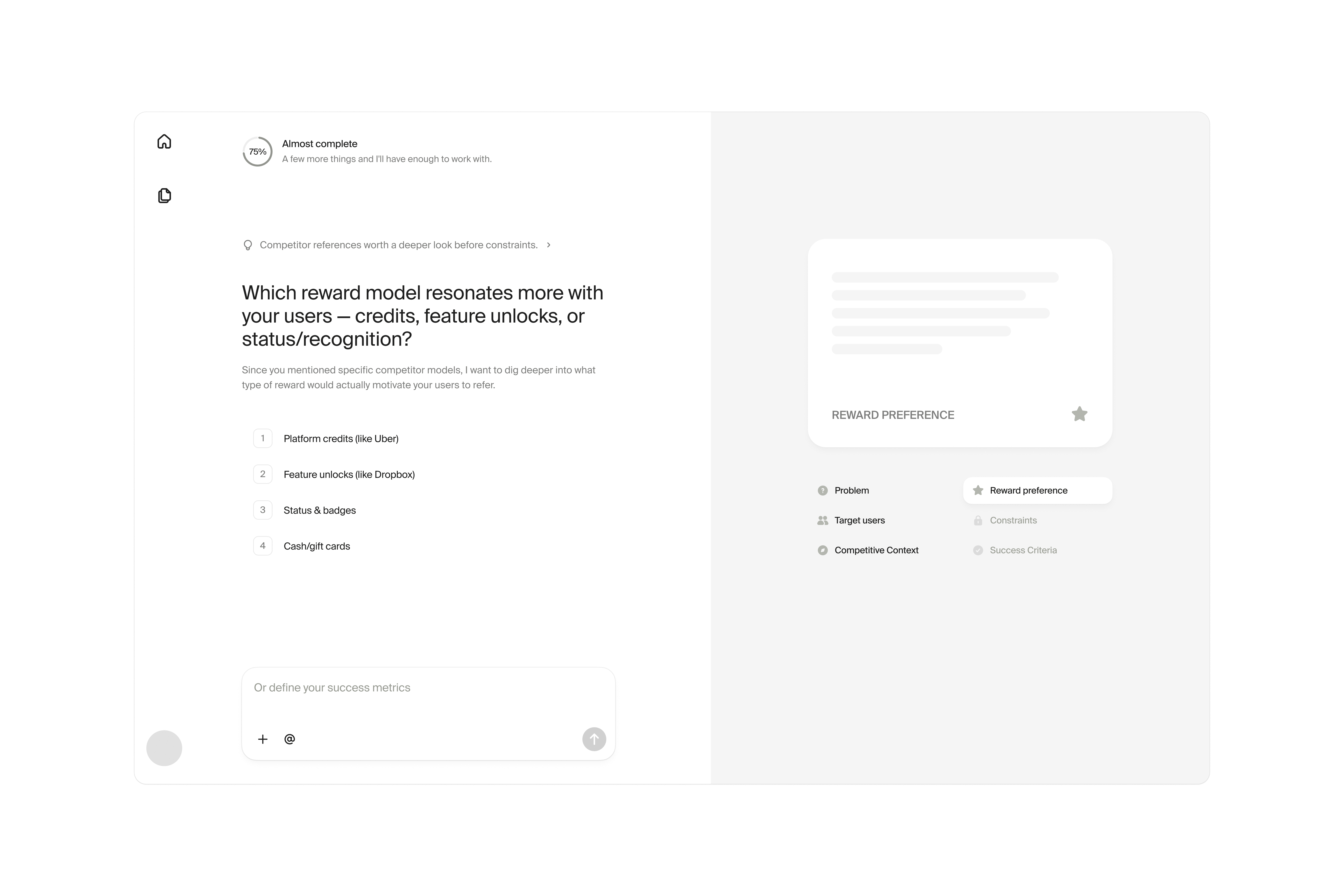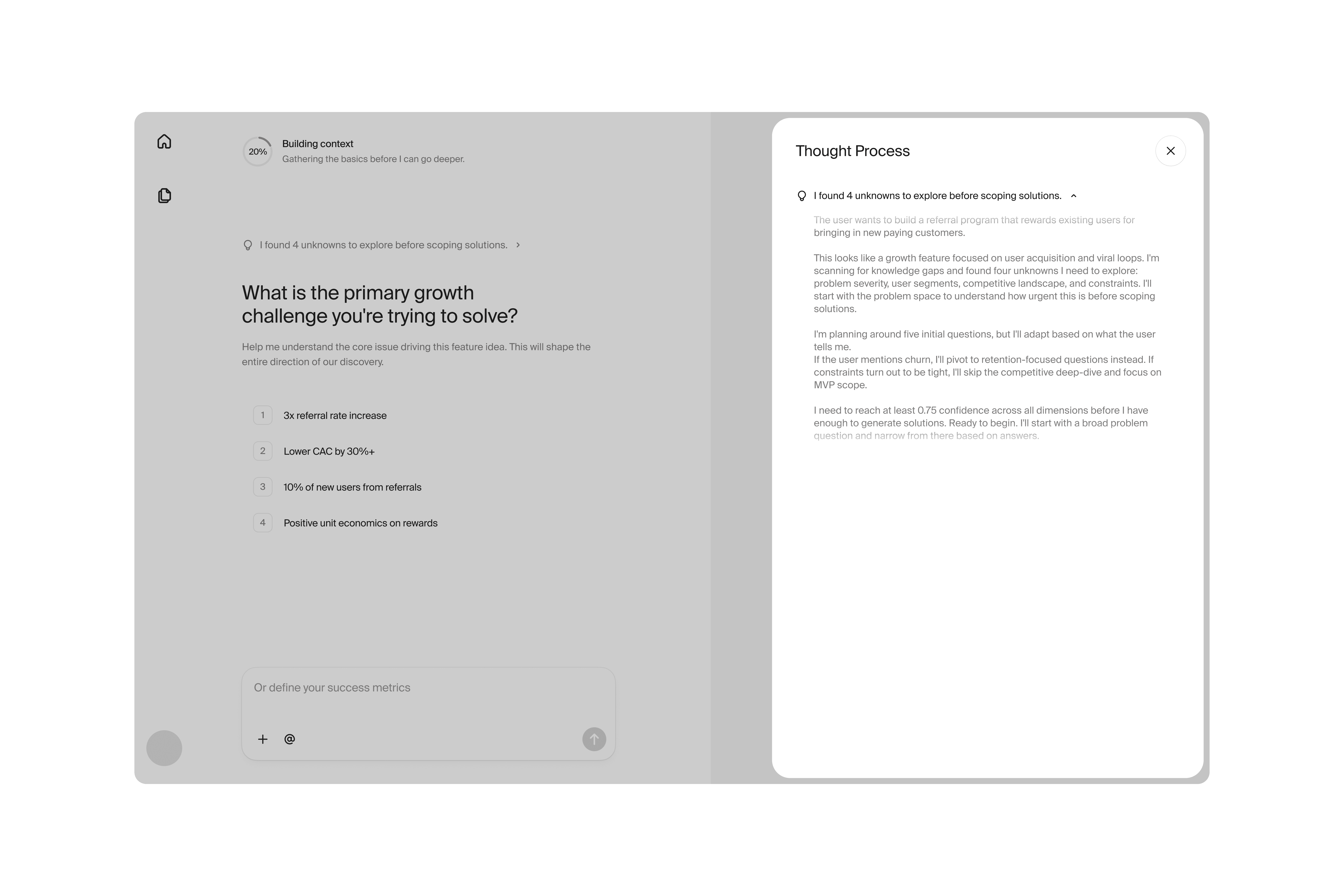 A concept exploring AI as a true product thinking partner. The agent plans its own discovery process, asks dynamic follow-up questions, and builds a structured understanding of the problem before proposing solutions and generating a PRD. This project is currently under progress. Please reach out if you're interested in learning more.